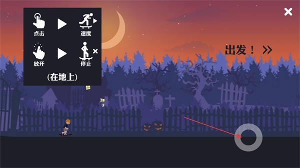 1、進(jìn)入游戲,查看操作提示,在地面時,點擊屏幕操控角色加速,松開停止,點擊右側(cè)圓環(huán)可開始游戲。