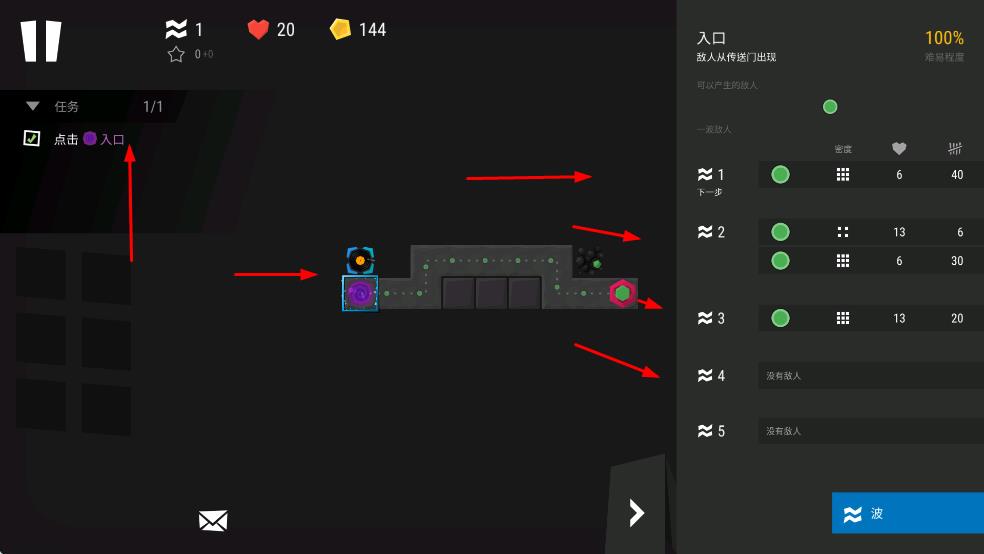 1、點(diǎn)擊紫色入口,開啟敵人波次進(jìn)攻,這是觸發(fā)防御戰(zhàn)斗的關(guān)鍵操作,開啟塔防挑戰(zhàn)之旅。