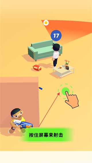 1、進入游戲,看到敵人頭頂?shù)乃{色數(shù)字如17,按住屏幕操控角色射擊。