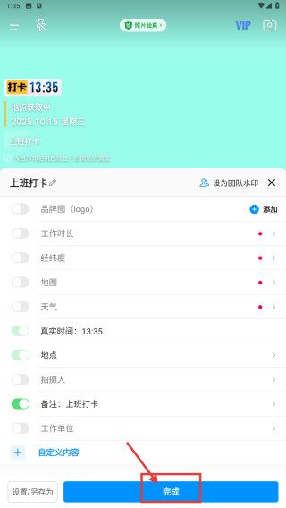 4、在水印編輯界面,確認(rèn)設(shè)置后點(diǎn)擊完成按鈕,生成上班打卡水印。
