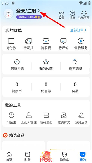 3、在個人中心頁面,點擊登錄/注冊,進入登錄注冊選擇頁面。