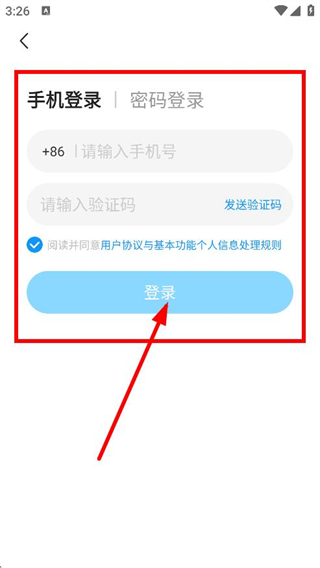 4、選擇手機登錄,輸入手機號、驗證碼后,點擊登錄,完成登錄操作。