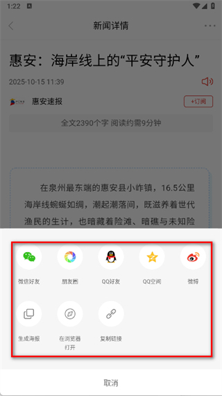 4、在分享選項(xiàng)中,選擇微信好友、朋友圈等平臺(tái)分享新聞。