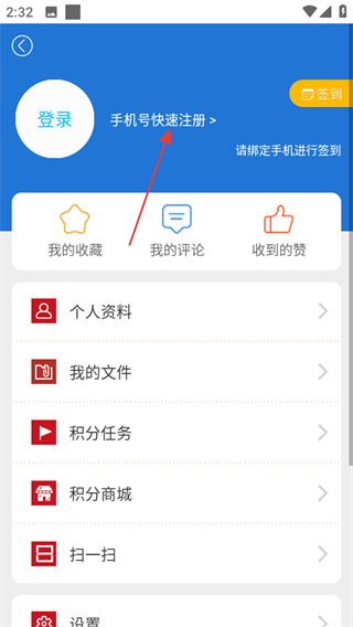 2、在個(gè)人相關(guān)頁(yè)面,點(diǎn)擊手機(jī)號(hào)快速注冊(cè),進(jìn)入登錄頁(yè)面。
