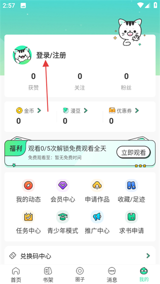 1、進入青漫,在首頁點擊底部我的,進入個人頁面。