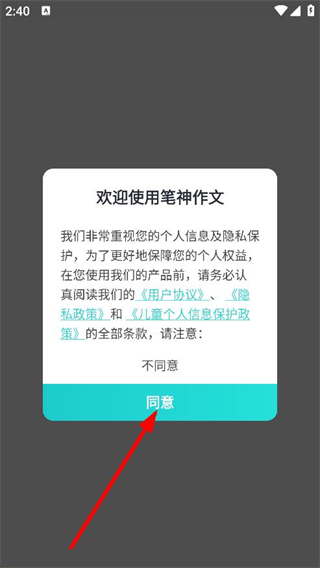 1、在歡迎使用筆神作文彈窗中,點(diǎn)擊同意,進(jìn)入APP主界面。