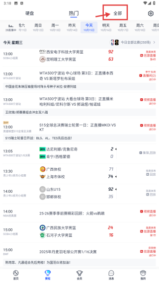 2、在賽程頁(yè)面,選擇全部分類(lèi),瀏覽全品類(lèi)賽事列表。