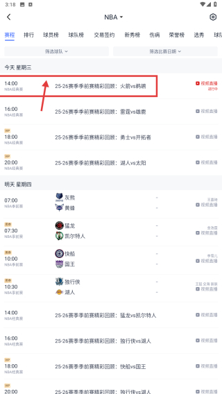 4、在NBA賽事詳情頁(yè),查看具體賽事如25-26賽季季前賽精彩回顧:火箭vs鵜鶘,了解賽事信息。