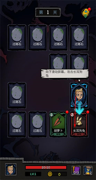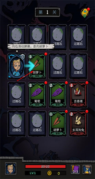 1、進(jìn)入第1關(guān)后,向右滑動(dòng)屏幕,走向胡蘿卜卡牌,獲取食物資源,開啟游戲之旅。