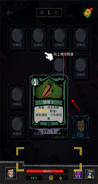 3、向上滑動(dòng)釋放胡蘿卜卡牌,恢復(fù)生命值、清除負(fù)面效果,保障角色生存,推動(dòng)游戲進(jìn)程。
