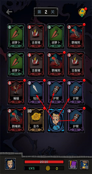 4、進(jìn)入第2關(guān),收集護(hù)臂等裝備卡牌,提升角色能力,同時(shí)應(yīng)對(duì)更多種類的怪物,持續(xù)挑戰(zhàn)更高關(guān)卡。