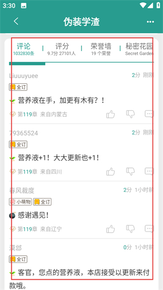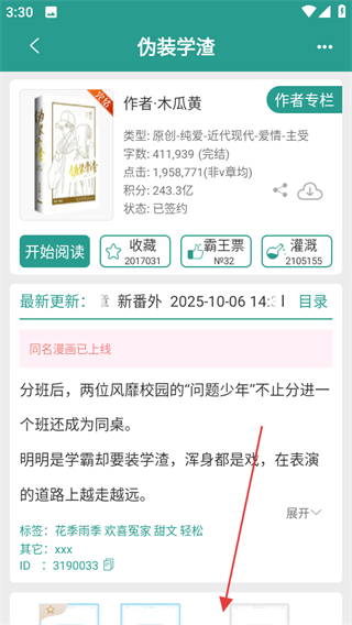 3、在偽裝學(xué)渣詳情頁(yè),可查看書(shū)籍信息,下滑進(jìn)入評(píng)論區(qū)。