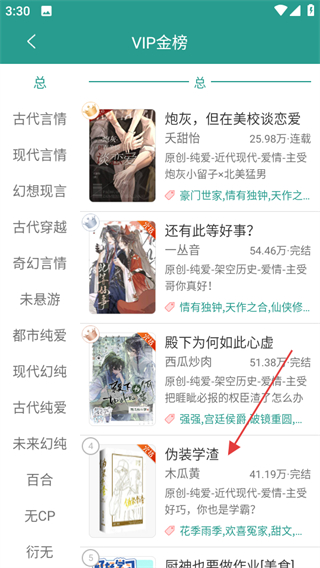 2、在VIP金榜頁(yè)面,選擇書(shū)籍偽裝學(xué)渣,進(jìn)入書(shū)籍詳情頁(yè)。