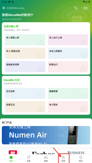 1、打開全球上網(wǎng)服務(wù)應(yīng)用,點(diǎn)擊底部商城選項(xiàng),進(jìn)入商城頁面。