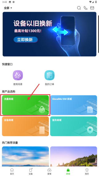 2、在商城頁面,選擇流量商城入口,進(jìn)入流量包選購界面。