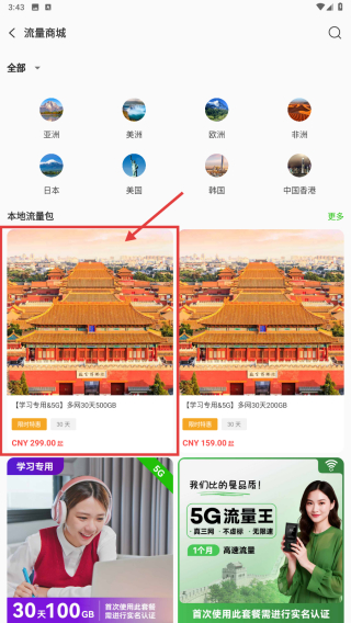 3、在流量包選購界面,瀏覽本地流量包列表,選擇學(xué)習(xí)專用流量包。