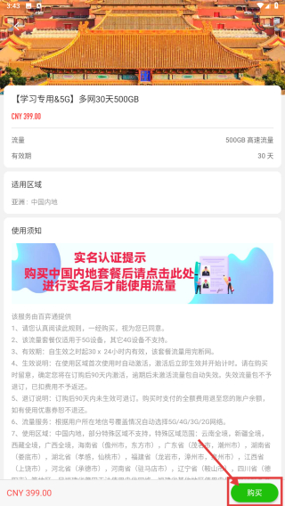 4、在流量包詳情頁,點(diǎn)擊購買按鈕,完成流量包購買操作。