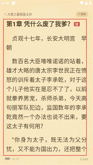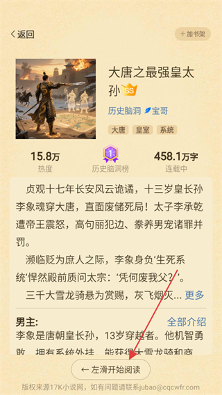 2、在大唐之最強(qiáng)皇太孫詳情頁,左滑開始閱讀書籍內(nèi)容。