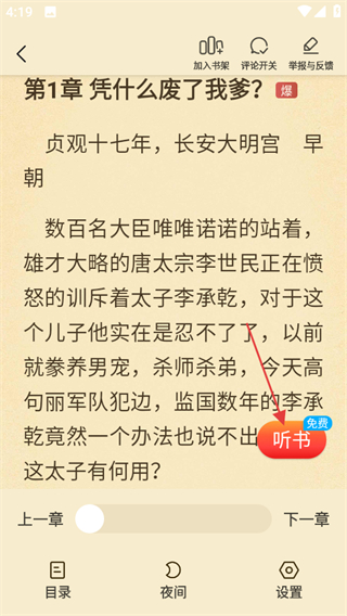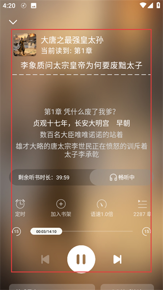5、在聽書模式下,即可收聽大唐之最強(qiáng)皇太孫書籍第一章內(nèi)容。