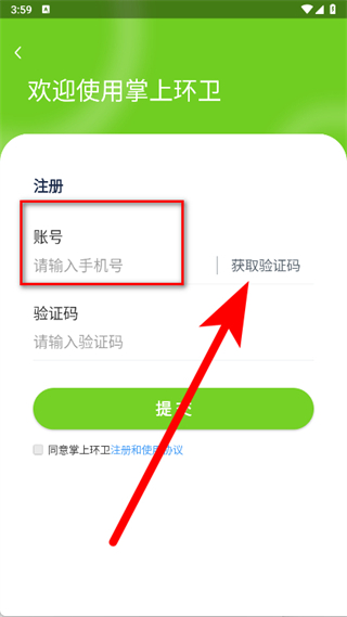 3、在注冊頁面,輸入手機號,接著點擊獲取驗證碼。