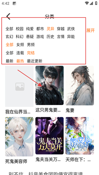 3、在分類選擇頁面,篩選出感興趣的分類點擊感興趣的小說進入。