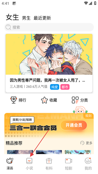 1、進入漫畫屋,在首頁點擊底部小說,進入小說頁面。
