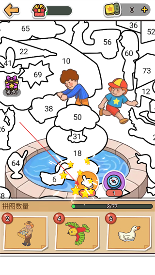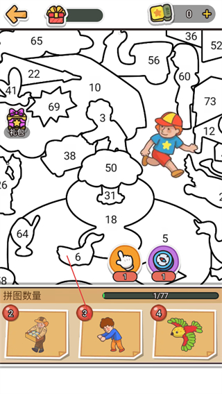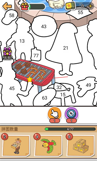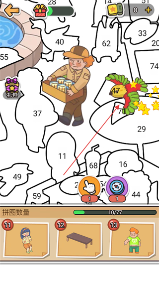 1、進入游戲界面,查看拼圖數(shù)量及進度條如1/77,點擊下方的拼圖碎片。