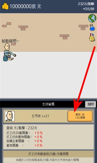 1、初始可點擊乞討秘笈里的乞丐帝相關,花費對應費用提升等級,等級提升能增加每次點擊獲得的京元數(shù)量,助力積累初始資源。