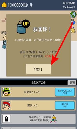 3、打工仔達到一定等級,會觸發(fā)等級獎勵提示,點擊Yes確認后,能提升相關效率,像乞丐帝的效率會因打工仔等級提升而上升,進一步加快京元獲取。