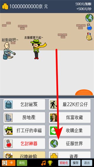 4、隨著游戲推進,還能解鎖收集征服世界等更高級玩法,同時也會有有趣的劇情互動,比如乞丐與時尚達人的對話,為游戲增添趣味。