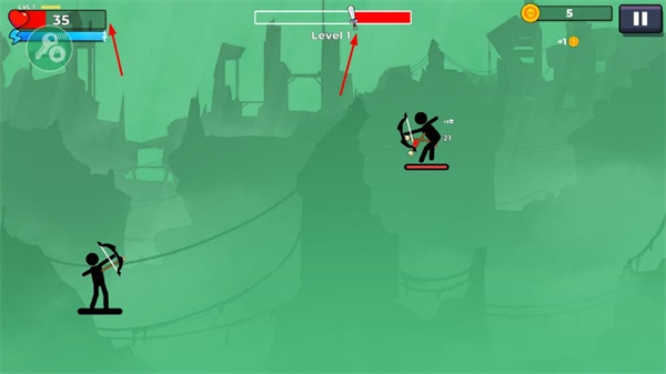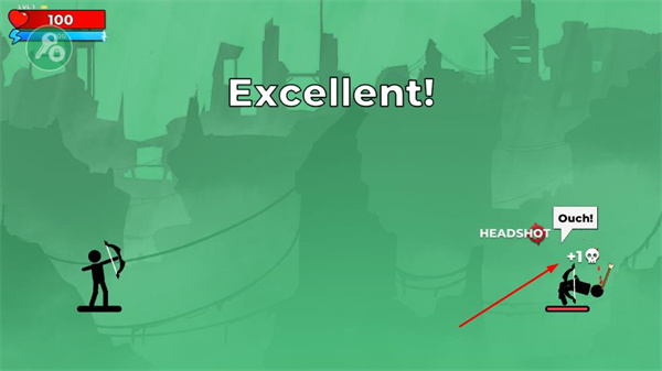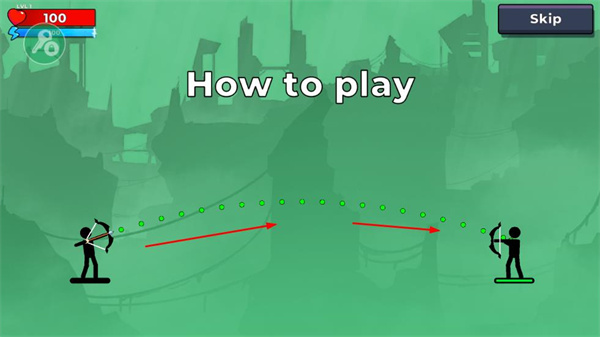 1、操控火柴人射箭,通過(guò)調(diào)整角度和力度射擊敵方火柴人,開(kāi)啟射箭對(duì)戰(zhàn)之旅。