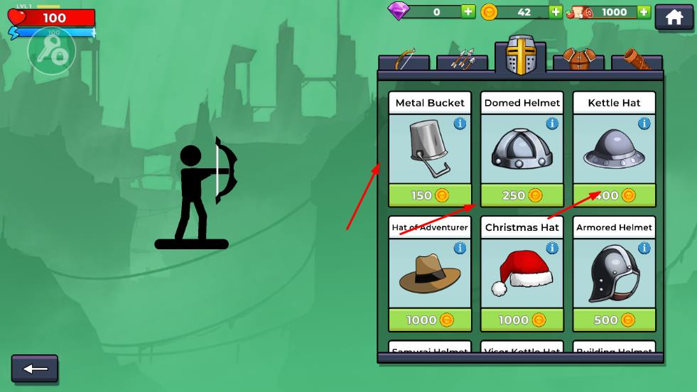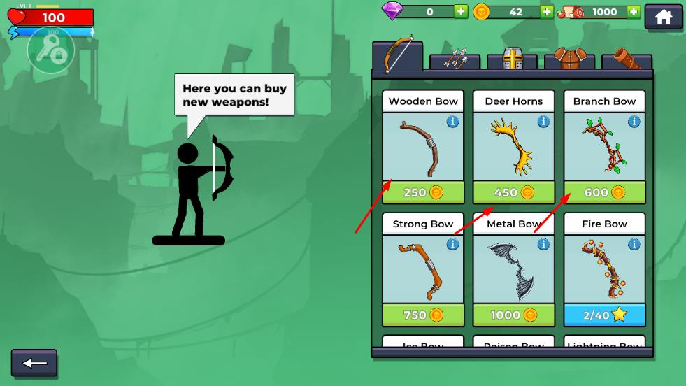 1、進(jìn)入商店可花費(fèi)金幣購(gòu)買(mǎi)新武器,提升射箭能力。