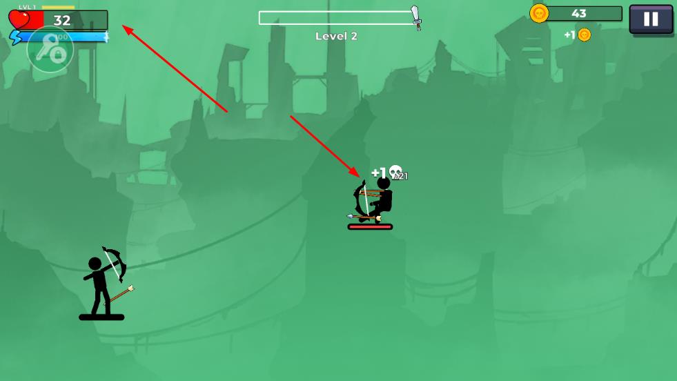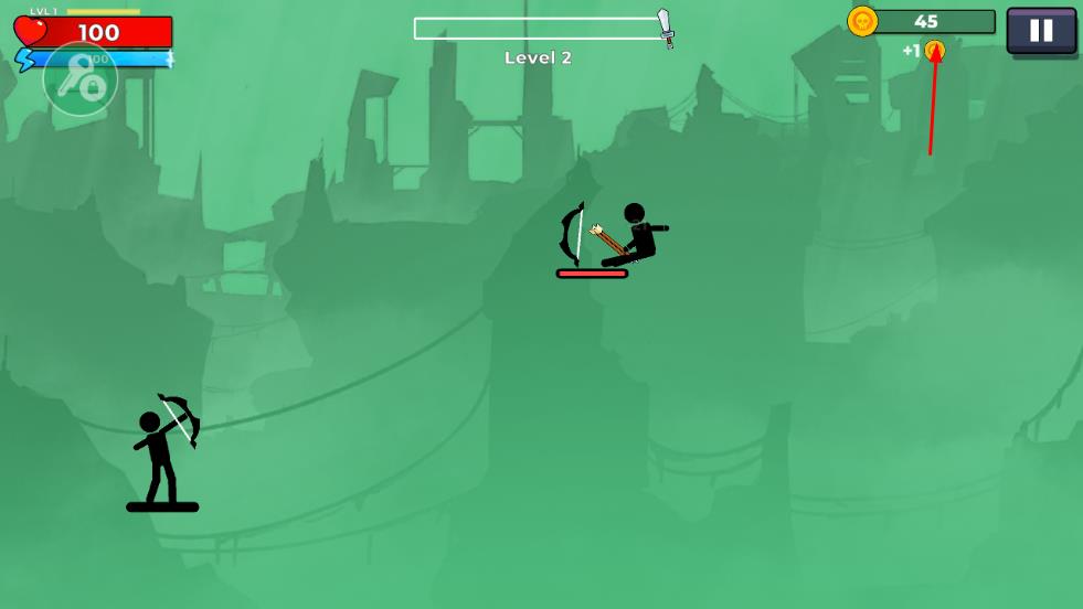3、在對(duì)戰(zhàn)中,操控火柴人射箭消滅敵方火柴人,同時(shí)關(guān)注自身生命值,合理規(guī)避傷害,推進(jìn)關(guān)卡進(jìn)程。