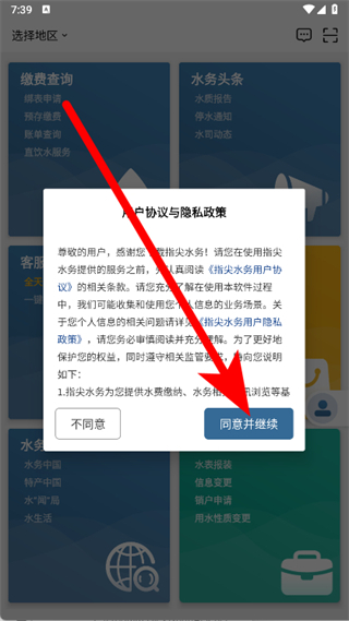 1、打開指尖水務(wù),點(diǎn)擊彈窗里的同意并繼續(xù)。