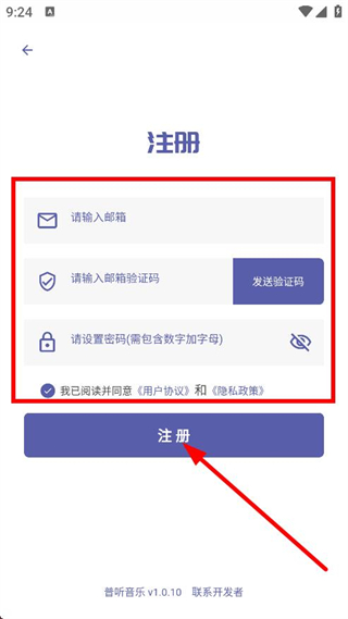 3、輸入郵箱、郵箱驗(yàn)證碼,設(shè)置包含數(shù)字和字母的密碼,點(diǎn)擊注冊(cè),完成注冊(cè)操作。