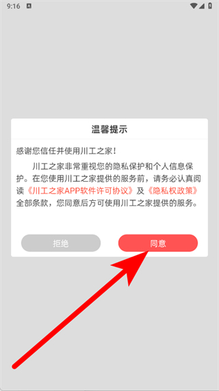 1、打開川工之家,在溫馨提示彈窗中點(diǎn)擊同意。