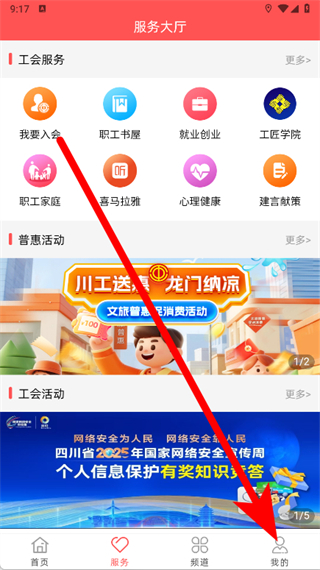 2、進(jìn)入服務(wù)大廳后,點(diǎn)擊底部導(dǎo)航欄的我的,進(jìn)入個(gè)人頁(yè)面。