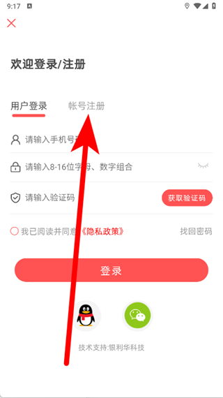 3、在歡迎登錄注冊(cè)頁(yè)面,點(diǎn)擊帳號(hào)注冊(cè)選項(xiàng),切換到注冊(cè)界面。