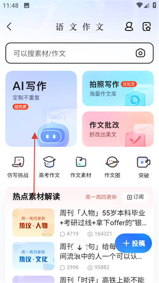 2、在語文作文頁面,點(diǎn)擊AI寫作,進(jìn)入AI寫作頁面。