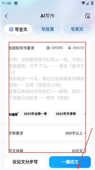 3、在AI寫作頁面,設(shè)置好信息后,點(diǎn)擊一鍵成文,生成作文內(nèi)容。