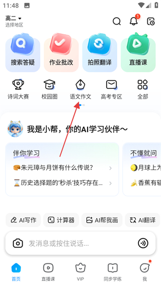 1、進(jìn)入作業(yè)幫首頁,點(diǎn)擊語文作文,進(jìn)入語文作文頁面。