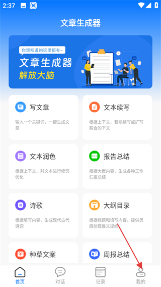 1、進(jìn)入文章生成器首頁(yè),點(diǎn)擊底部我的,進(jìn)入個(gè)人頁(yè)面。