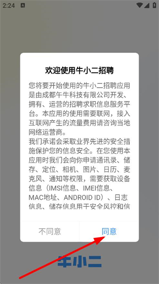 1、在牛小二招聘APP的歡迎彈窗中,點(diǎn)擊同意,進(jìn)入登錄頁面。