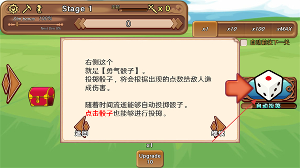 1、進(jìn)入游戲界面,了解Stage1的基本操作,右側(cè)勇氣骰子可點(diǎn)擊投擲,也能隨時間自動投擲對敵人造成傷害。