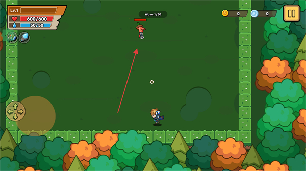 1、游戲開始,通過(guò)左側(cè)虛擬搖桿操控角色移動(dòng),接近敵人。