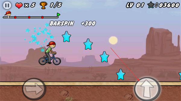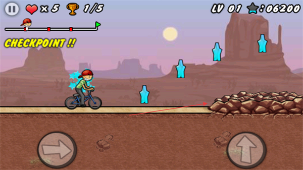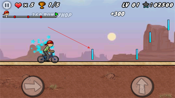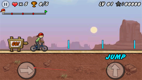 2、騎行過(guò)程中,遇到藍(lán)色豎桿障礙,及時(shí)點(diǎn)擊右側(cè)JUMP按鈕控制男孩跳躍躲避。
