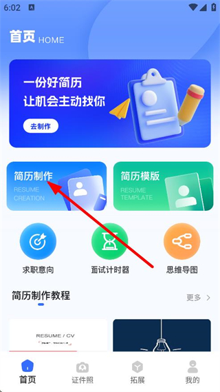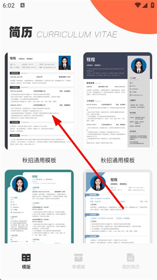 1、在求職類APP的首頁,點(diǎn)擊簡歷制作,進(jìn)入簡歷模板選擇頁面。