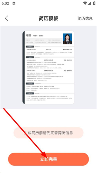 3、在簡歷模板詳情頁面,點(diǎn)擊立即完善,進(jìn)入簡歷信息填寫頁面。