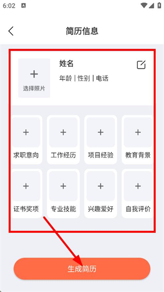 4、在簡歷信息填寫頁面,完善姓名、求職意向等信息后,點(diǎn)擊生成簡歷。