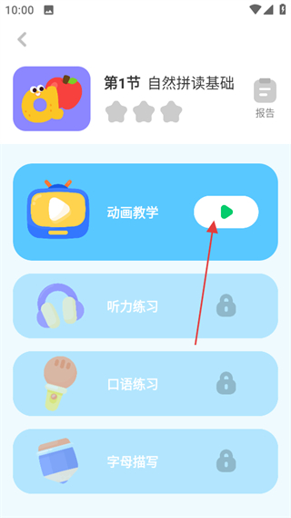 2、在學(xué)習(xí)頁(yè)面,找到第1節(jié)自然拼讀基礎(chǔ)課程,點(diǎn)擊播放按鈕,進(jìn)入課程學(xué)習(xí)頁(yè)面。
